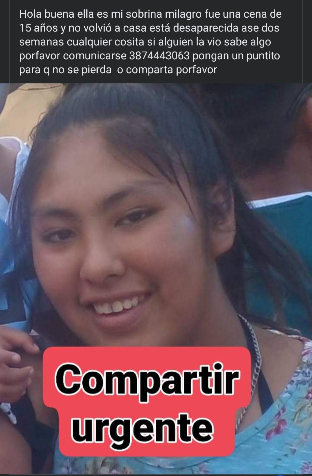 La familia ha recurrido a las redes sociales para pedir ayuda. A través de Facebook, su tía Lorena publicó un mensaje solicitando información que pueda ayudar a encontrar a Milagro.