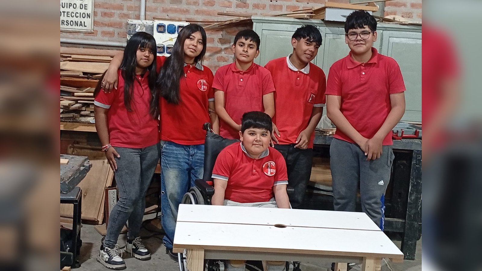 La historia comenzó en el taller de carpintería, a cargo del profesor Walter Navarro. Allí, Mariano necesitaba un espacio ergonómico que le permitiera trabajar con comodidad. Fue entonces cuando sus compañeros —Valentino, Zoe, Emilia, Bautista y Tomás— decidieron tomar la iniciativa y diseñar una mesa especialmente pensada para él.