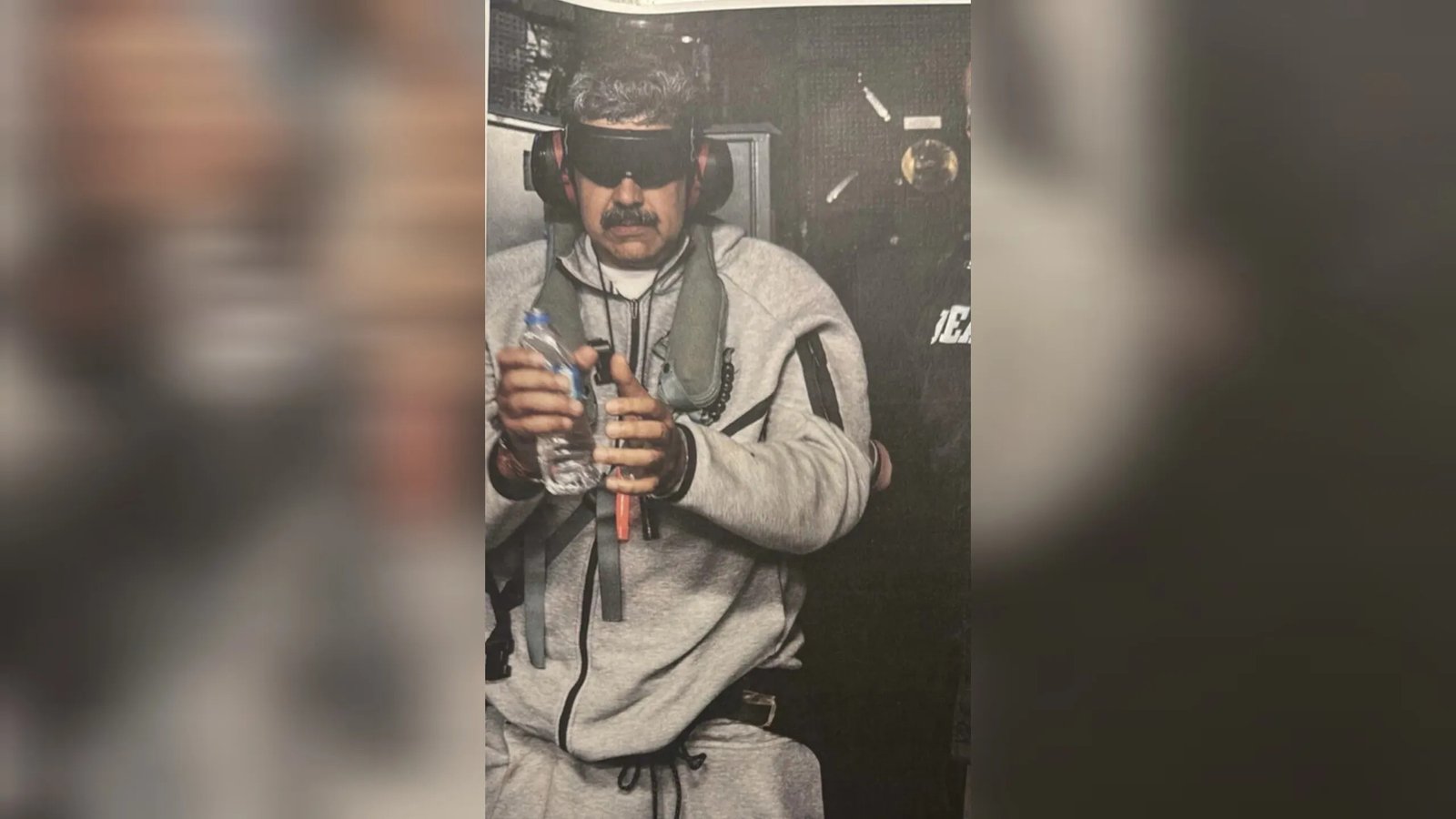 En la imagen, Maduro aparece de pie, con los ojos cubiertos, las manos esposadas y vestido con un conjunto deportivo de color gris. También se lo observa utilizando gafas de protección y audífonos protectores, mientras sostiene una botella de agua entre las manos. A su lado se encuentra un funcionario de la Administración para el Control de Drogas (DEA), según se aprecia en la fotografía.